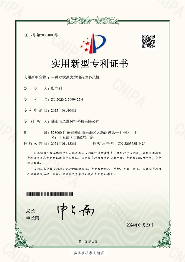 一種立式退火爐軸流離心風(fēng)機(jī)-專利證書