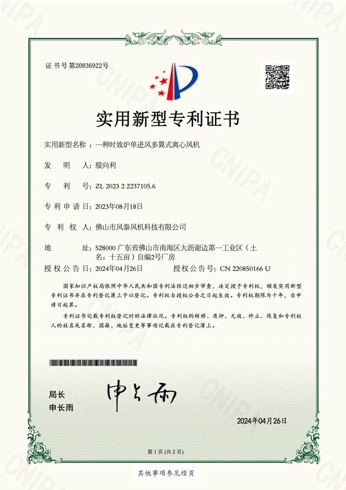 一種時(shí)效爐單進(jìn)風(fēng)多翼式離心風(fēng)機(jī)-專利證書